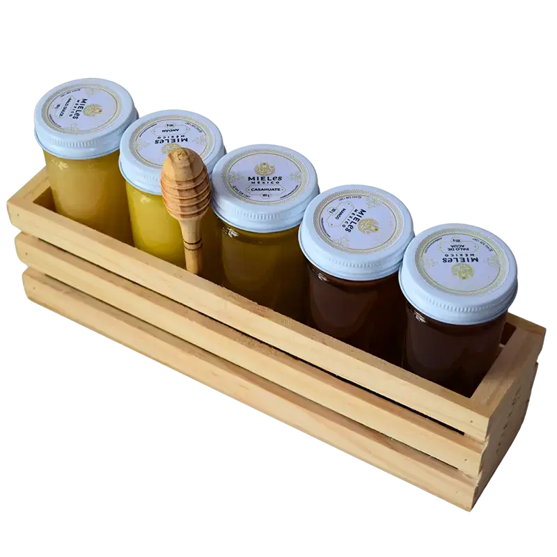 Cajita de madera con 5 frascos de 180 g de miel de abeja cruda, pura y natural proveniente del néctar de 5 flores diferentes.